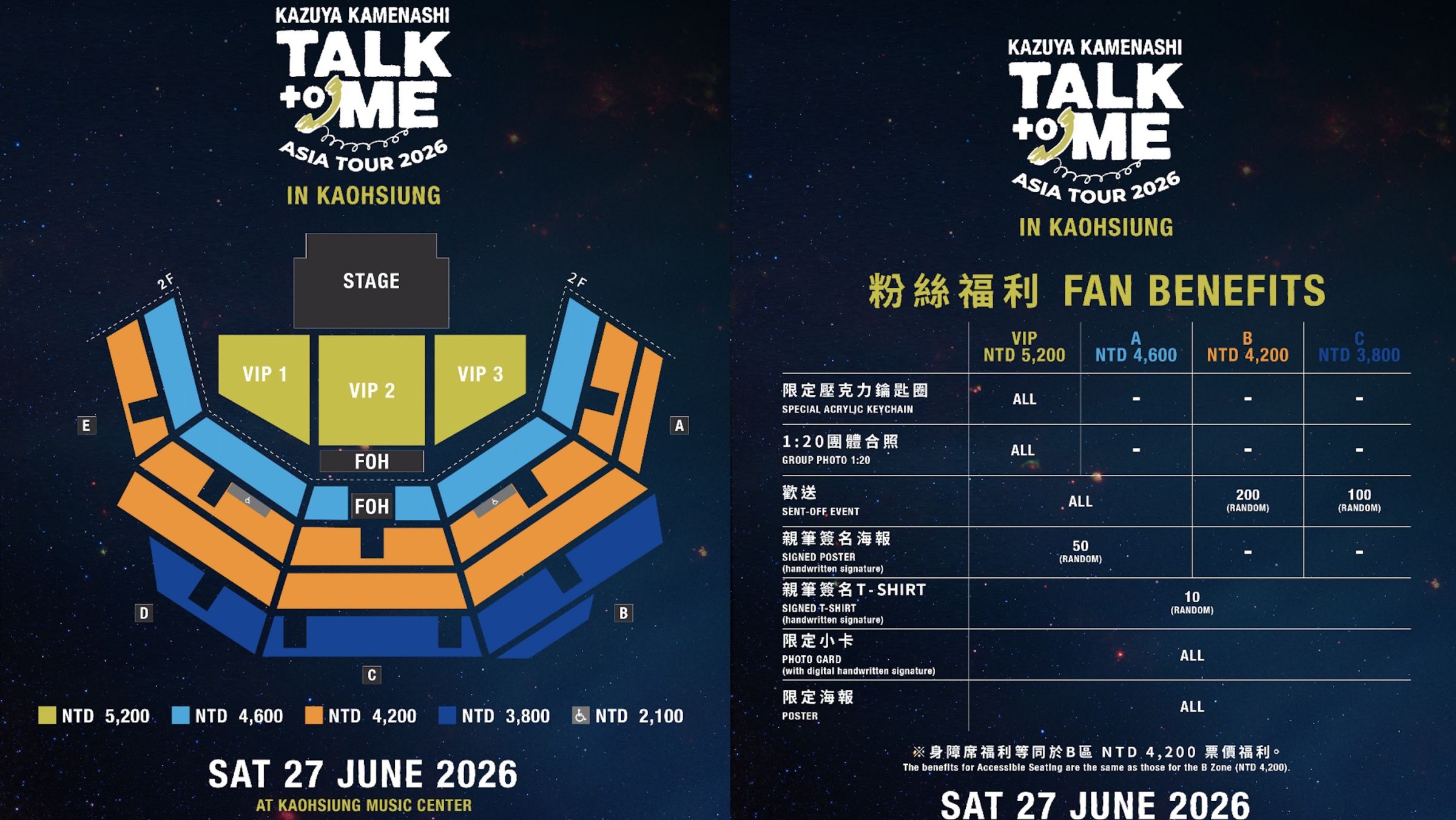 全新巡迴《KAZUYA KAMENASHI “TALK TO ME” ASIA TOUR 2026》將於 2026 年自曼谷啟程,陸續前往香港等亞洲城市巡演,將於 6 月 27 日在高雄流行音樂中心登場,如同巡演主題「TALK TO ME」所傳達的概念,亀梨和也透過舞台上的每一次對話與交流、與粉絲近距離互動,帶來專屬於彼此的感動時刻。此次演出票價分為 NT$ 5,200 / NT$ 4,600 / NT$ 4,200 / NT$ 3,800,VIP寵粉福利內容包含 特製鑰匙圈、團體合照(1對20)、SENT-OFF活動、簽名海報、簽名T-Shirt、照片小卡、海報等,誠意滿滿。門票將於 3月7日(六) 中午12點在拓元售票系統全面開賣。