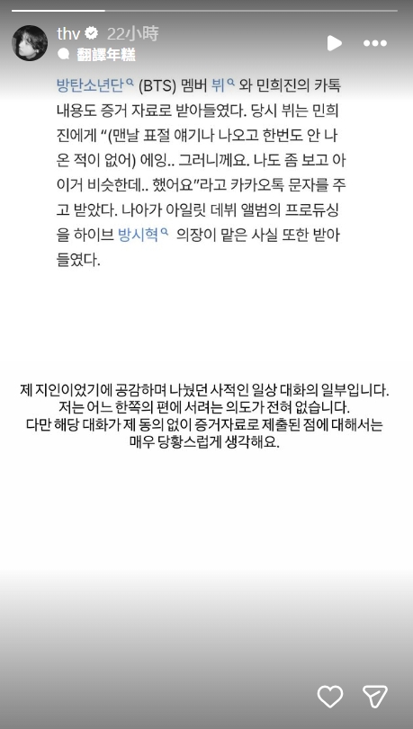對此,V於20日透過 IG 限時動態親自回應,貼出相關新聞截圖並發聲澄清。他表示,閔熙珍只是自己的熟人,當時分享訊息僅是出於共鳴的私人對話,「完全沒有選邊站的意思」,並坦言對於私下聊天內容在未經本人同意的情況下,被提交為法院證據感到相當困惑與不解。