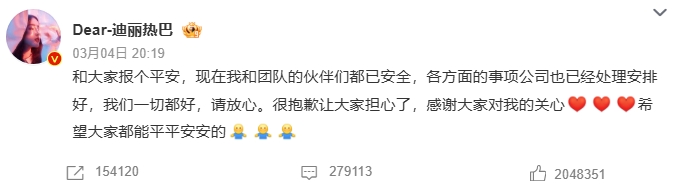 滯留消息在網路曝光後,粉絲焦急等待她的近況更新,卻遲遲未見本人出面說明,引發更多揣測與擔憂。直到4日晚間,迪麗熱巴終於親自透過微博發聲:「和大家報個平安,現在我和團隊的伙伴們都已安全,各方面的事項公司也已經處理安排好,我們一切都好,請放心。」她也對外界關心表示感謝,並為讓粉絲擔心致歉。