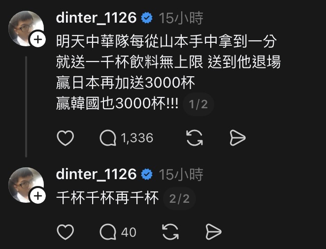 WBC/中華隊今晚對決山本由伸!丁特 threads 放話:每從山本手上拿一分就請1000杯飲料!無上限