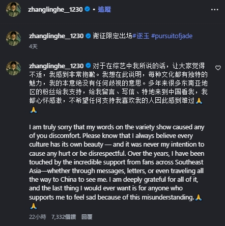 面對外界質疑,張凌赫10日透過Instagram最新貼文的留言區發文回應,以中文與英文雙語向觀眾道歉。他表示,自己在節目中的發言若讓人感到不適,深感抱歉,並強調「每一種文化都有其獨特魅力,我的本意絕沒有任何歧視的意思」。他也提到,自己多年來受到許多來自東南亞粉絲的支持與鼓勵,對此一直心懷感激,因此不希望任何喜歡或支持自己的人因此感到難過。