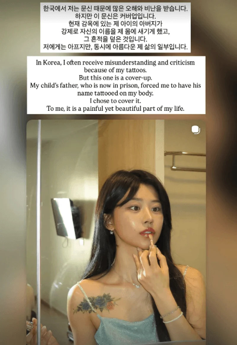 她進一步指出,過去與前夫在一起時曾被強迫將名字刺在身上,如今選擇以新的刺青覆蓋,不只是為了美觀,更像是替那段痛苦記憶畫下一個句點。對她而言,這道刺青雖然帶著傷痕,卻同時也象徵著自己走過的歷程,因此有著複雜且深刻的意義。