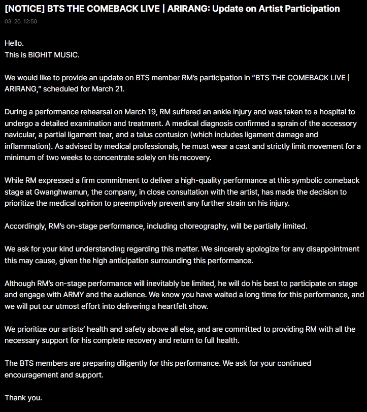 所屬公司 BIGHIT MUSIC 於21日發布官方聲明,說明RM在3月19日進行演出彩排時不慎扭傷腳踝,隨即前往醫院接受詳細檢查與治療。經診斷結果顯示,RM出現副舟骨扭傷、部分韌帶撕裂以及距骨挫傷,並伴隨韌帶損傷與發炎情形。醫療團隊建議需進行石膏固定,並在至少兩週內盡量減少活動,專心休養。
