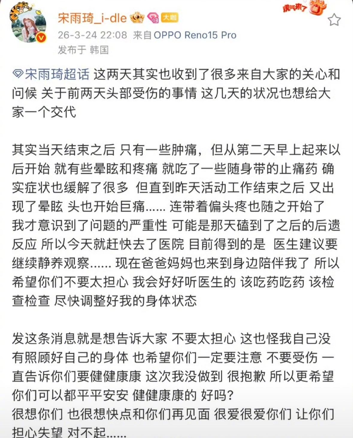 韓國女團i-dle成員宋雨琦日前在曼谷巡演時,意外撞上舞台升降設備導致頭部受傷,當時現場畫面曝光後,她一度站不穩的狀況讓粉絲相當擔憂。而3月31日宋雨琦也親自發長文報告近況,證實目前仍需靜養治療,沒辦法劇烈運動,確定將暫時缺席節目《奔跑吧》第14季錄製。