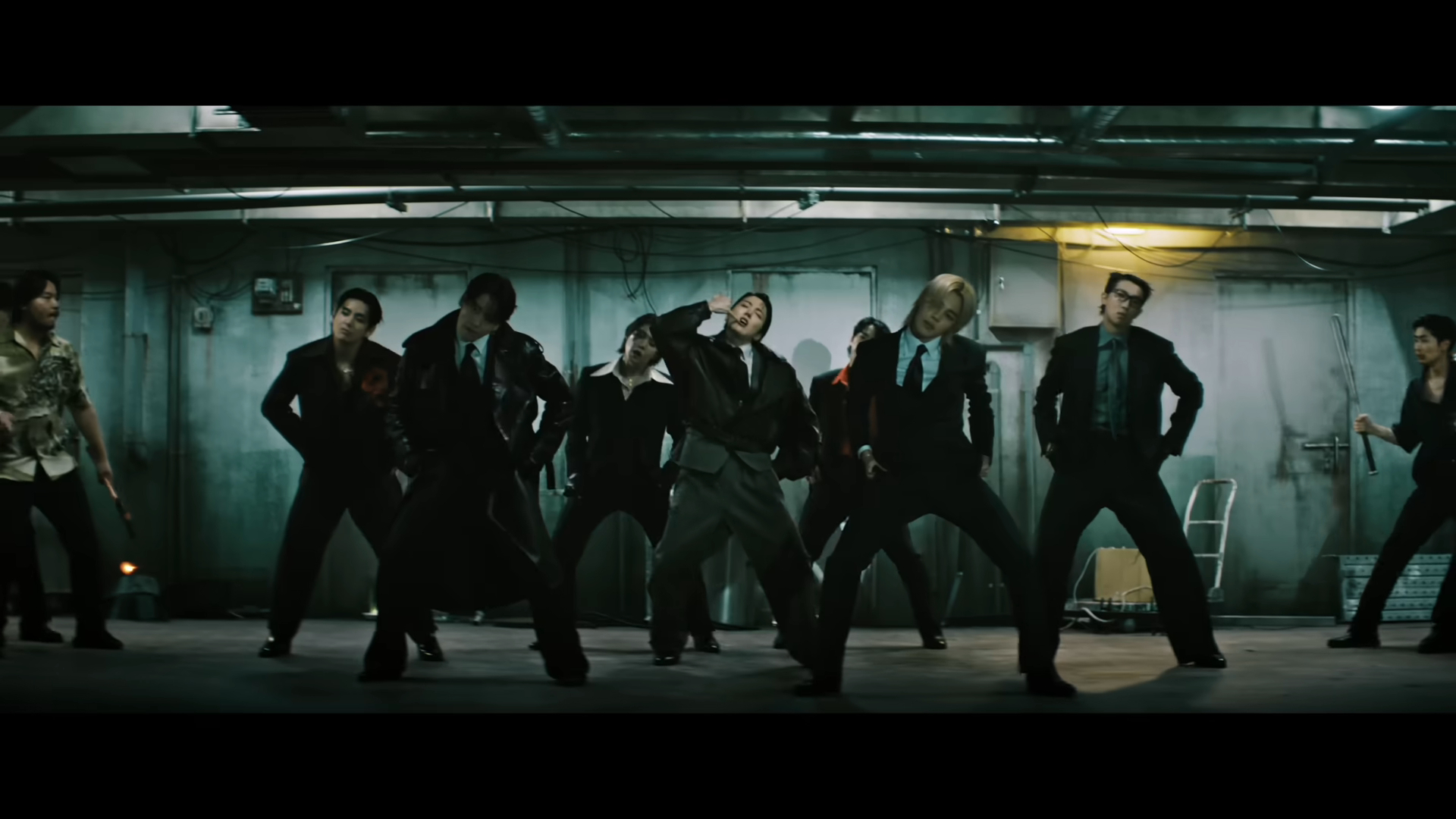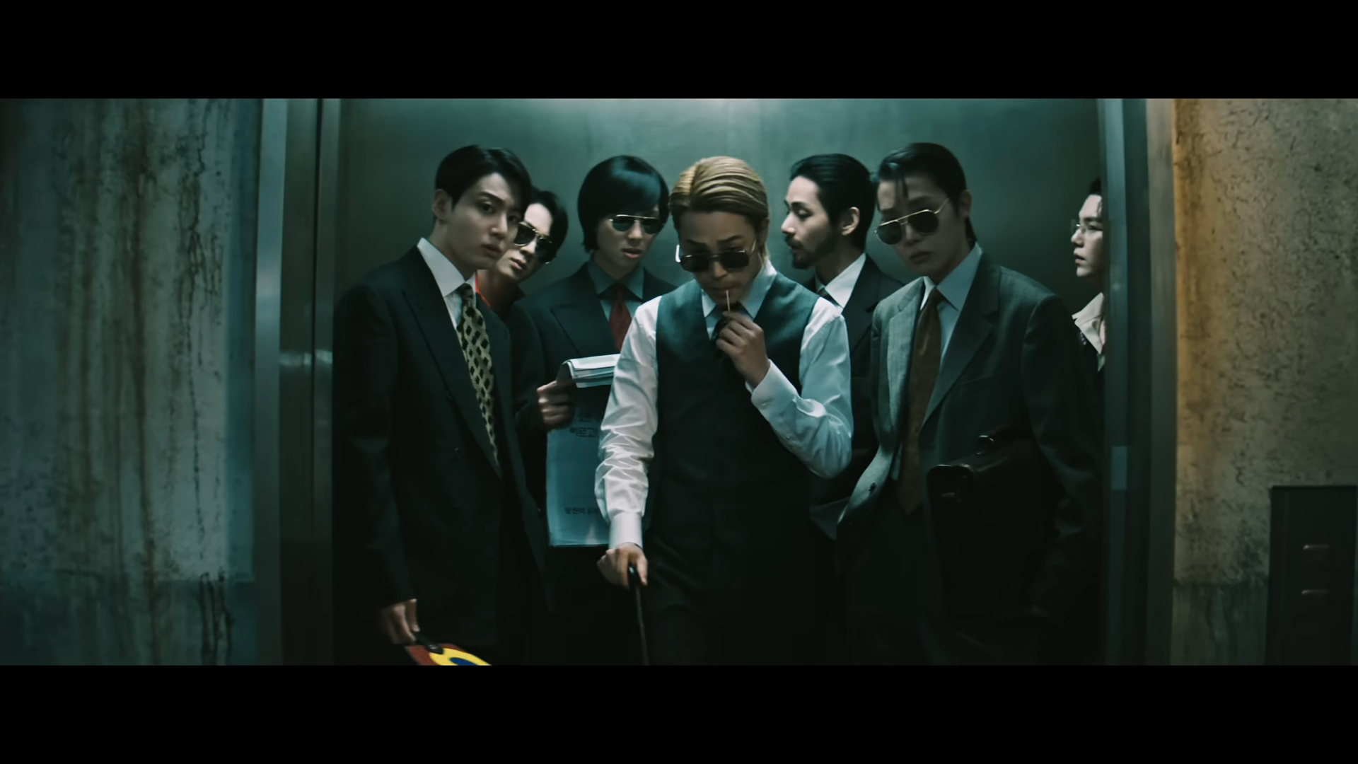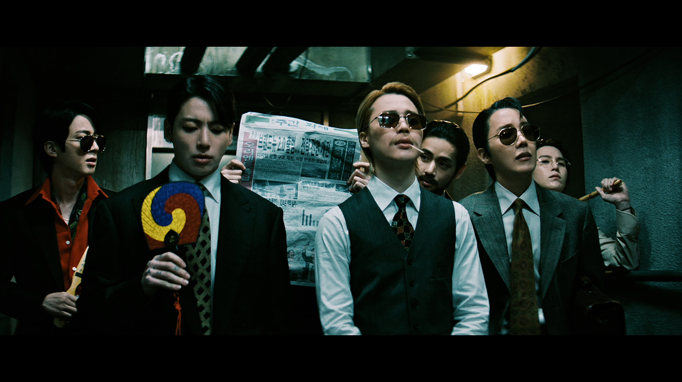 MV一開場,老舊電梯門緩緩打開,成員們身穿西裝、戴著墨鏡登場,與走廊中一群氣場強烈的人物對峙,彷彿黑色電影主角現身,氛圍緊繃又充滿張力。然而下一秒畫風突變——抓背棒、太極扇、短簫、棒棒糖,甚至倒拿報紙等「反差感滿滿」的道具接連出現,再加上鬍子妝造型,讓嚴肅場面瞬間變得荒謬又爆笑,完美展現BTS一貫的幽默感。