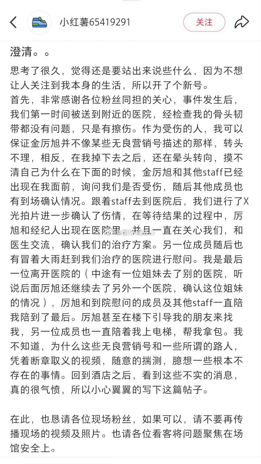 該名粉絲進一步透露,事發後在工作人員陪同下前往醫院檢查,經X光確認僅有擦傷,骨頭與韌帶皆無大礙。而厲旭與經紀人更是全程守在醫院,積極與醫師溝通治療方式,期間甚至還有其他成員冒雨趕到醫院探視,讓她相當感動。她也提到,自己是最後一位離開醫院的人,厲旭一路陪伴到最後,甚至親自下樓引導她的朋友前來接應,另一位成員也貼心陪同她搭電梯、協助提包。對於網路上部分斷章取義的影片與揣測言論,她直言無法理解,認為外界應將焦點放在場館安全問題,而非對藝人進行不必要的指責。