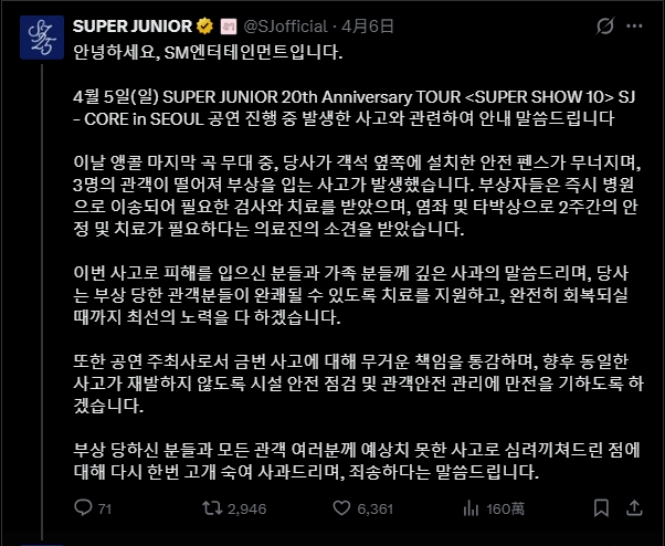 SM娛樂也強調,將全力支援受傷觀眾的醫療與後續復原,同時承諾會全面檢視場館設施與安全管理流程,避免類似事件再次發生,並向所有受到驚嚇的觀眾表達誠摯歉意。