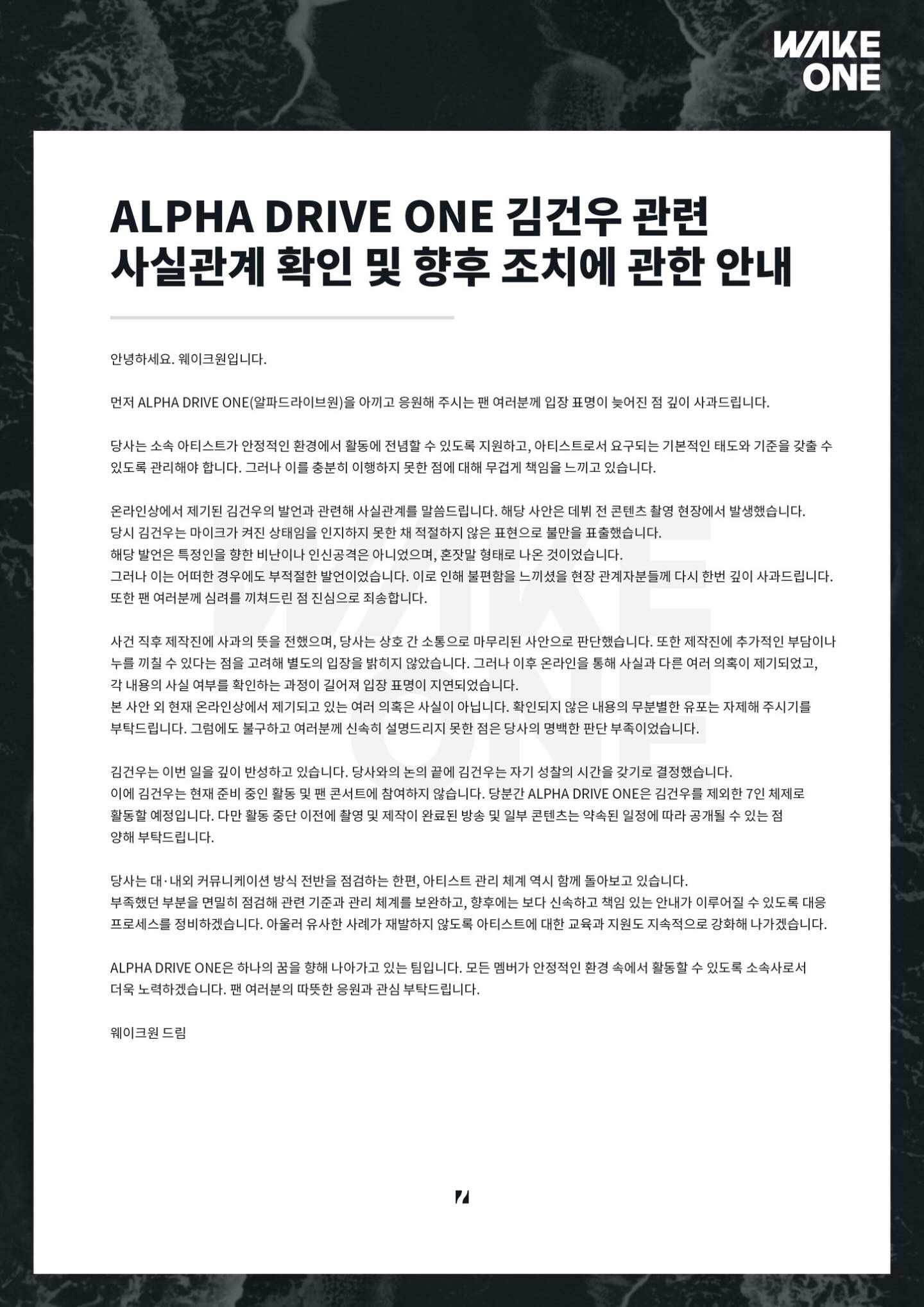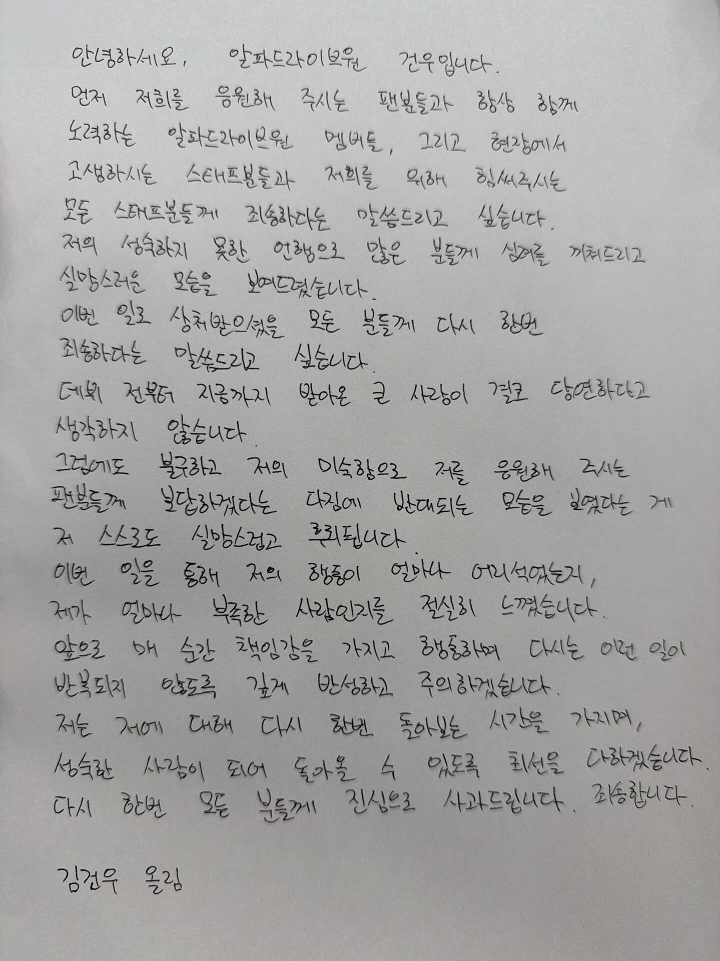 金虔佑本人也再度透過手寫信向粉絲、隊友及工作人員致歉,坦言因自身不成熟的言行讓大家失望,「我深刻體認到自己的愚蠢與不足」,並承諾會反省與改進,未來以更成熟的樣貌回歸。