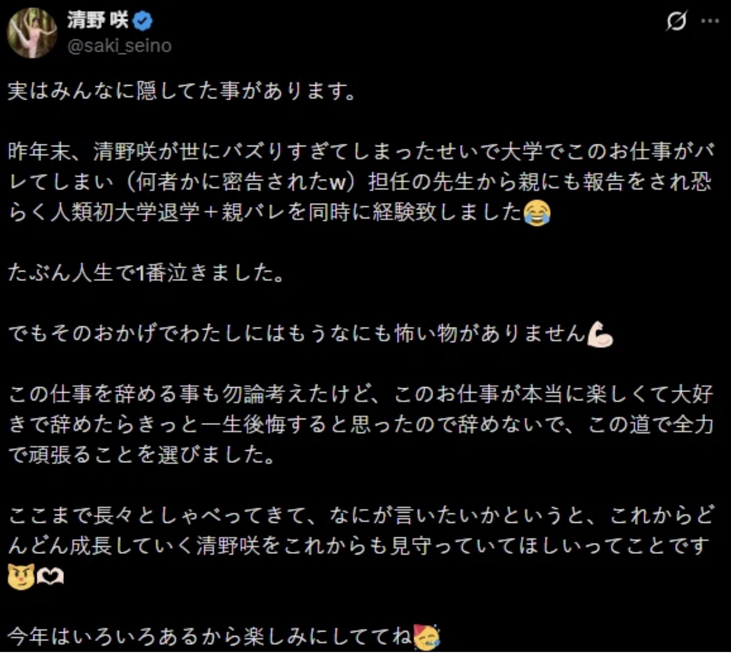 經歷接連打擊,清野咲在X上發出長文坦言曾一度失去方向,但在沉澱過後,她選擇重新站起來,並更堅定面對自己的選擇,強調若因外界壓力放棄才會留下遺憾。儘管爭議不斷,她仍持續投入工作,也逐漸調整心態向前邁進。這段從爆紅到低潮再到重新出發的歷程,也讓外界更加關注她未來的發展。