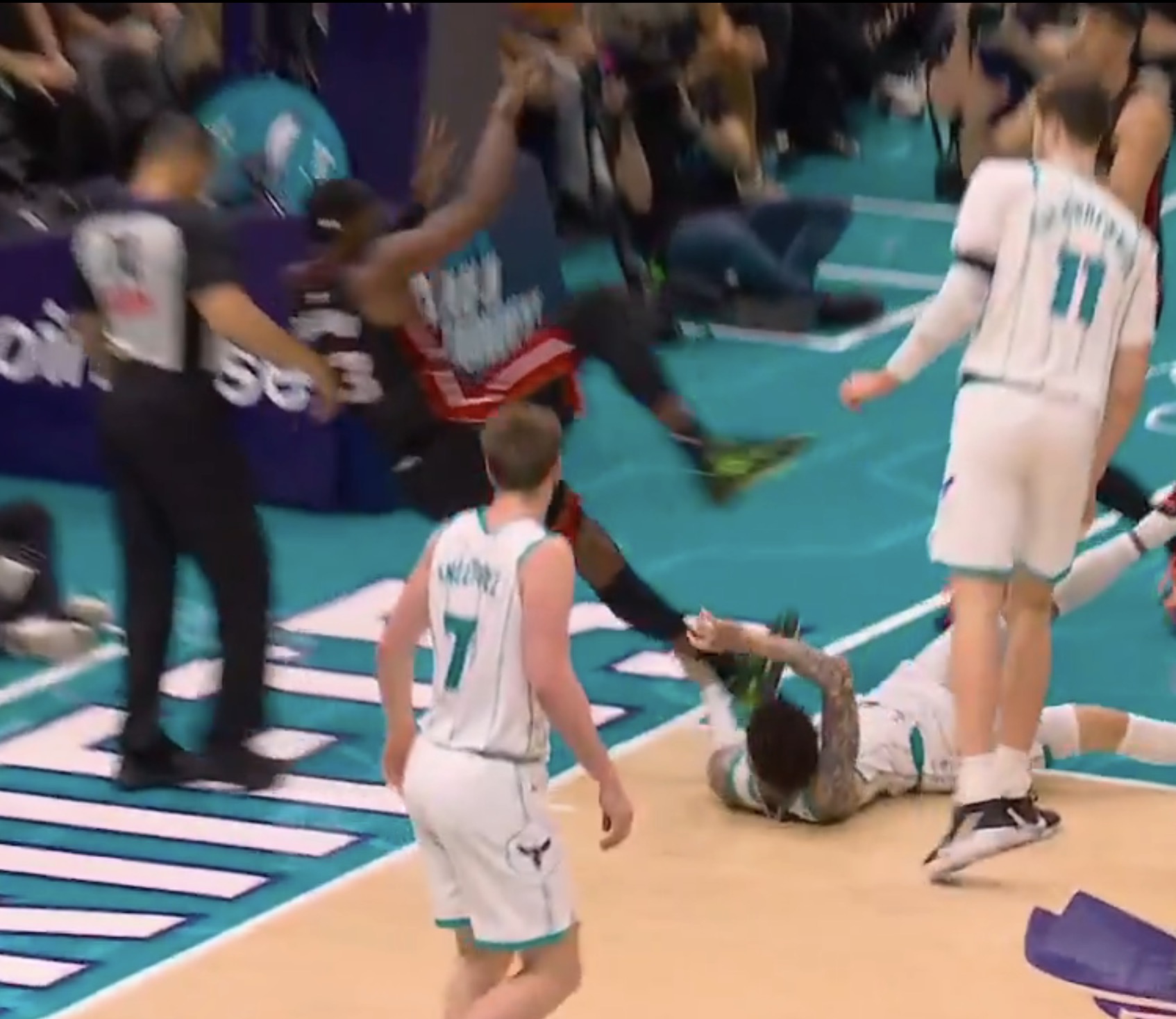NBA 附加賽在今天(15日)正式開打!沒想到在首場比賽就發生意外事件,在邁阿密熱火對戰夏洛特黃蜂的比賽,第二節才剛開始熱火球星中鋒阿德巴約 Bam Adebayo 在一次搶球過程中,疑似遭到黃蜂球星「三球」LaMelo Ball 從後方抓腳,導致他瞬間失去重心「尾椎重落地」,當場痛苦倒地不起,最後只能由旁人攙扶離場,震撼畫面讓全場球迷瞬間屏息!