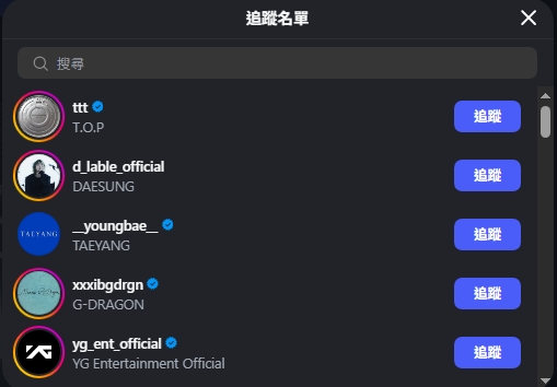 不過,比起帳號本身開通,最讓外界引發討論的,其實是「追蹤名單」。除了現役三位成員與所屬公司YG Entertainment外,官方竟同步追蹤了已於2022年宣布退團的T.O.P個人帳號。這個看似簡單的動作,在20週年這個時間點卻顯得格外耐人尋味,也讓粉絲瞬間陷入各種揣測。