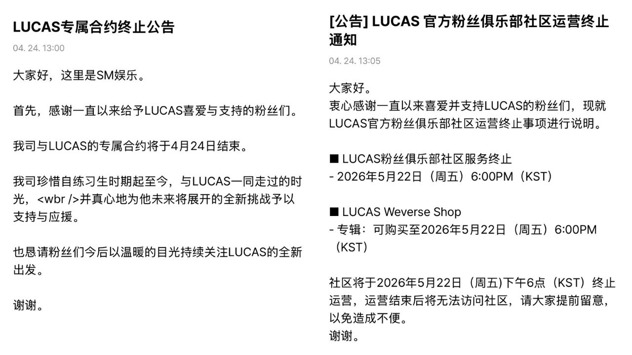 根據公告內容,SM娛樂方面表示:「我司與Lucas的專屬合約將於4月24日結束。」同時也提到,從練習生時期一路走來的合作時光相當珍貴,並對Lucas未來的發展給予支持與祝福。隨後,SM娛樂也同步透過官方社群再次確認消息,正式為這段長達8年的經紀關係畫下句點。