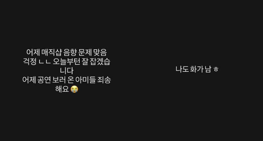 面對輿論延燒,柾國也親自出面回應。他透過Instagram限時動態坦言,在演唱〈Magic Shop〉時確實出現音響問題,並向現場觀眾致歉。他寫下:「昨天〈Magic Shop〉表演時發生了聲音問題,大家不要擔心,從今天開始我會修正。對昨天來看演出的ARMY們感到抱歉。」隨後更補上一句:「我也很生氣。」一句話道出當下心情。