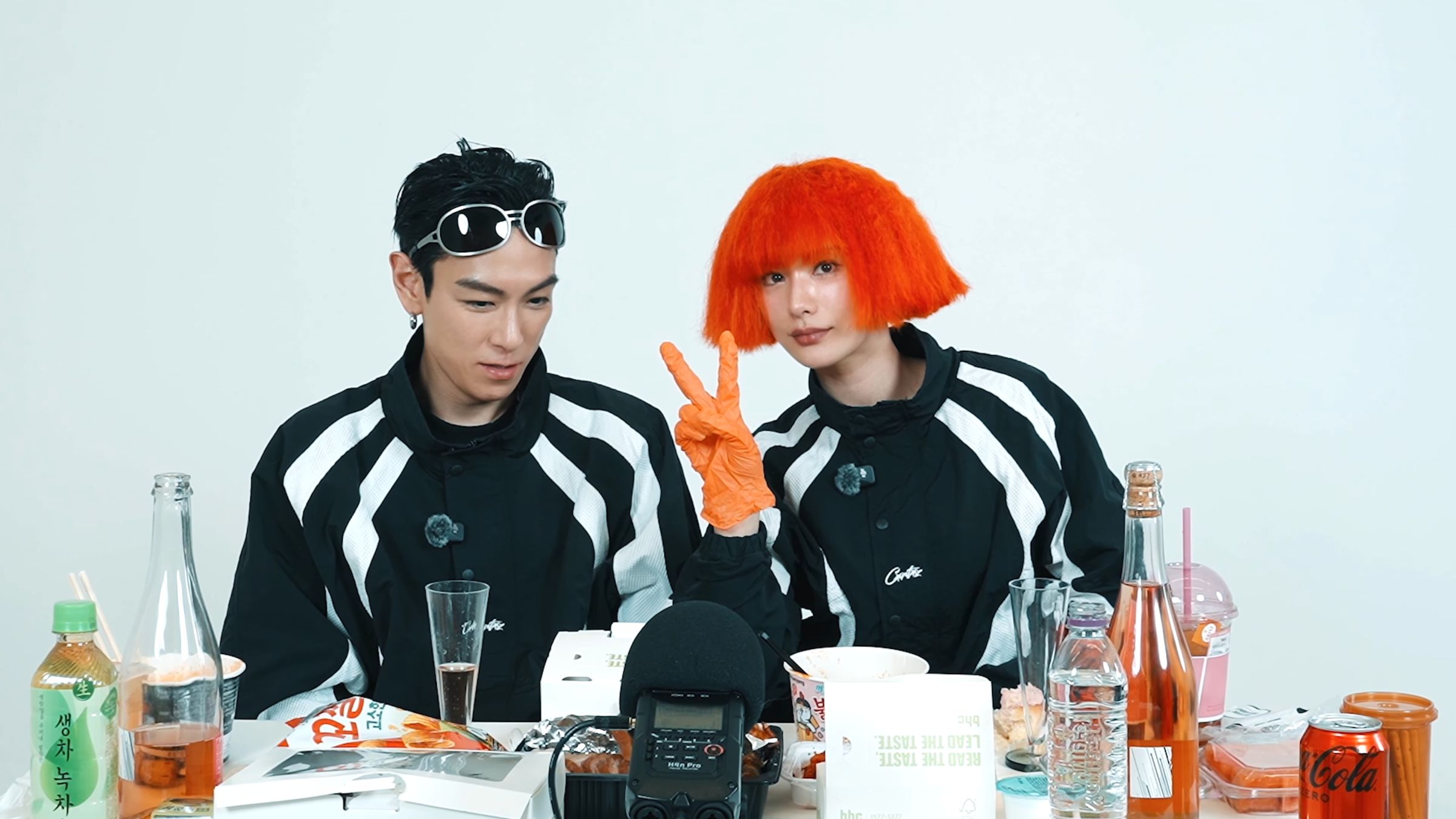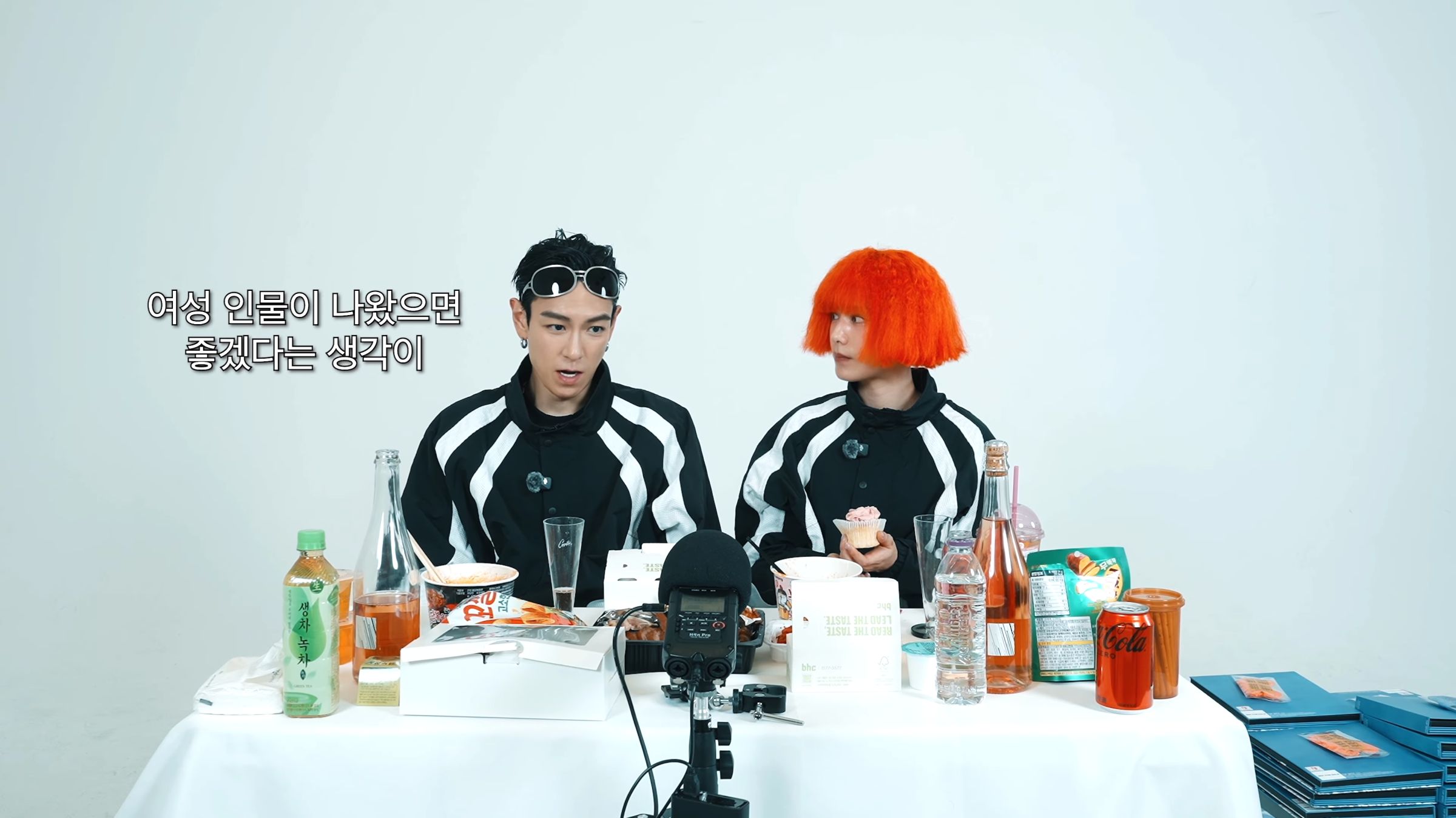 影片中,T.O.P延續MV造型,以護目鏡搭配率性風格登場,維持一貫冷調魅力;Nana則以吸睛的橘色短髮現身,強烈視覺對比瞬間抓住目光。兩人坐在擺滿泡麵、豬腳與零食的餐桌前進行吃播,雖話不多卻更顯氣氛微妙,甚至當MV播到Nana的畫面時,她還突然起身即興跳舞,讓一旁的T.O.P忍不住露出笑容,互動自然又有火花。
