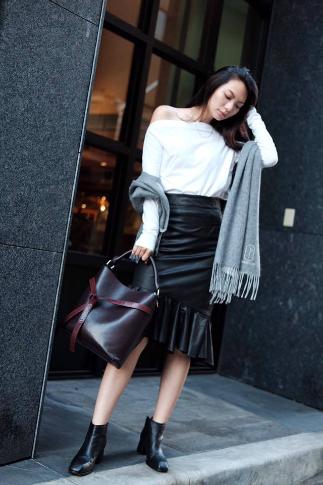 ▼一字領白 Tee 從秋天穿到冬天也完全不是問題,冬季搭配保暖的皮裙、圍巾,就可以優雅出門囉!
