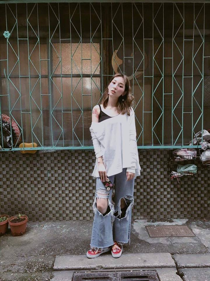 ▼想嘗試更有層次感的穿搭,內搭小可愛,把寬版的白 Tee 拉成斜肩,下半身搭配破損感單寧寬褲,個性女孩的穿搭成就達成!