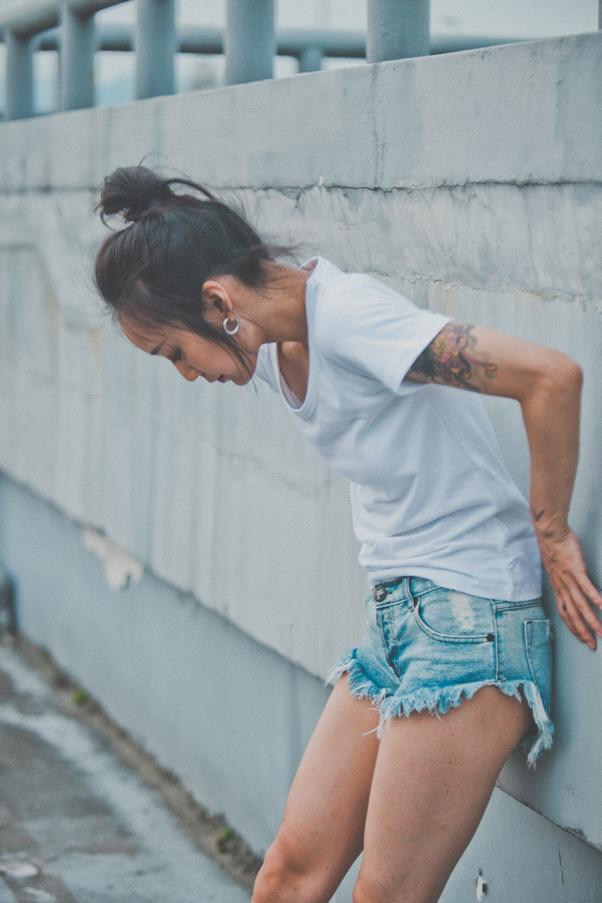 ▼圓領白 Tee 直接搭配單寧短褲,也是夏天很常見的穿搭方式。將白 Tee 微微紮入褲頭,可以讓比例變得更好。