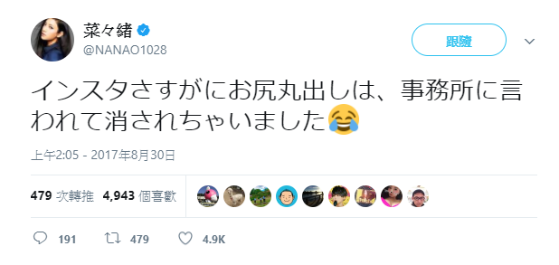 ▼不過沒多久這張照片就火速在 IG 上被刪除,菜菜緒在推特笑說:「在 IG 上放出的屁股照片,被事務所唸了所以只好刪掉。 」不過許多網友都已經截圖下來,互相傳送著這一張性感的裸臀照,畢竟這對於日本名人來說還是相當大膽的尺度。