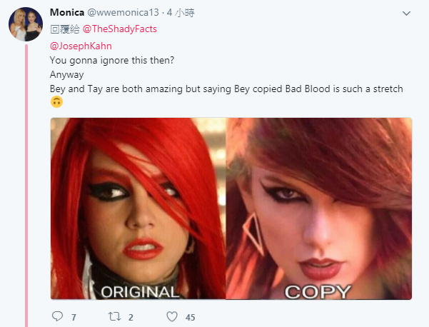 Joseph Kahn 現在直接回嗆:「那根本不是模仿《Formation》,他們試圖將泰勒絲黑色的服裝和碧昂絲連結在一起,但他們忘了泰勒絲在 2015 年《Bad Blood》時就已經穿了黑色裝,所以我認真這麼想,是碧昂絲抄襲了《Bad Blood》。」