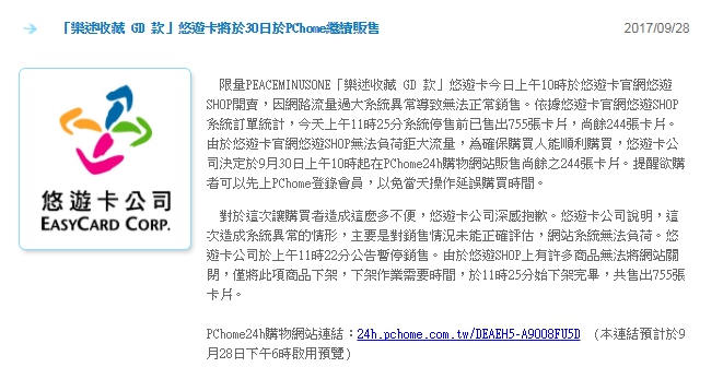 G-Dragon 權志龍的潮流耳機品牌 PEACEMINUSONE – MUSIC x TAIWAN 推出聯名悠遊卡話題不斷,原先訂於昨日(27日)分別於悠遊卡官網以及四大超商通路正式上市,卻在前幾天遭粉絲質疑超商黑箱,獨惠親朋好友。今天還不到十點,悠遊卡網站就已被粉絲擠爆癱瘓,期盼已久的「GD 款」被迫暫時停賣。