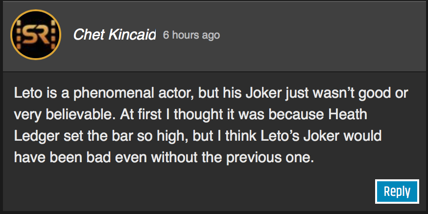 不過其實身為公眾人物就很難顧到所有觀眾,甚至有許多網友將傑瑞德雷托和「前任小丑」希斯萊傑作比較,但不同的時代、劇本及個性必定會有不同的演出風格,在接下來仍會和 DC 合作演出《哈莉奎茵 vs. 小丑》( Harley Quinn vs. The Joker ) 電影的傑瑞德雷托,相信聚焦在他和瑪格羅比 ( Margot Robbie ) 的故事,也會讓傑瑞德雷托有更多空間可以發揮他的演技。