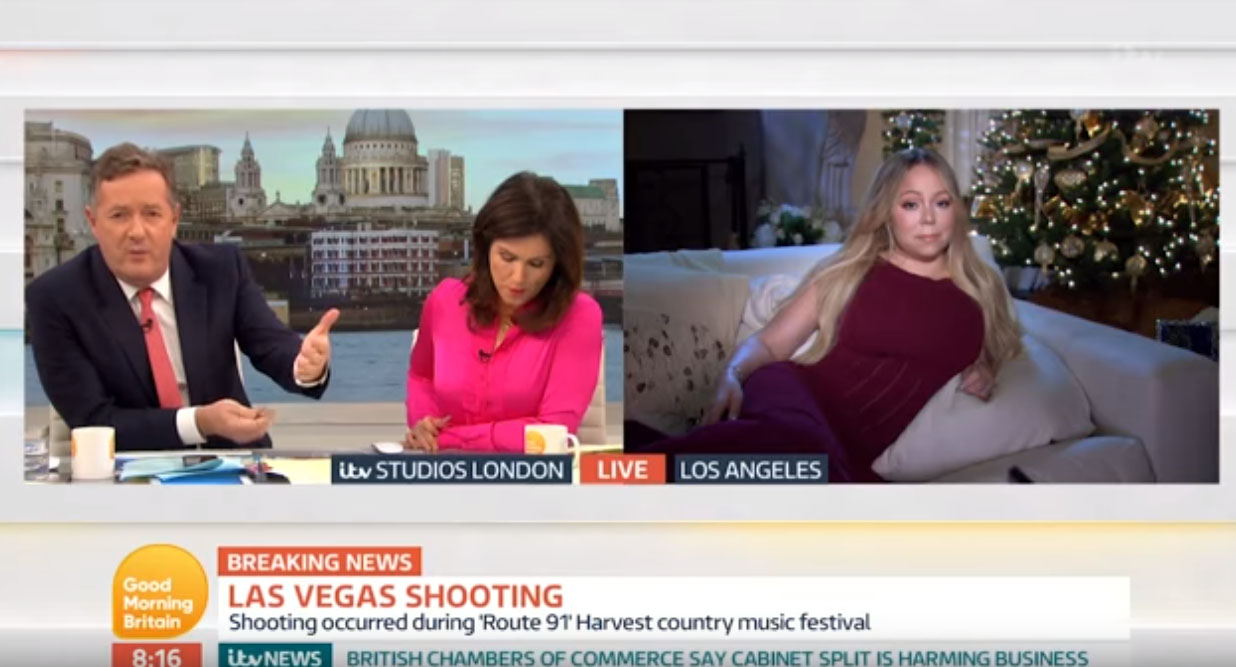 美國疑似再次受到恐怖攻擊,在拉斯維加斯鄉村音樂節,槍手在飯店的 32 樓拿槍掃射數百發子彈死傷慘重,再度讓美國人活在恐懼之中,而電視台也訪問到了歌手瑪麗亞凱莉( Mariah Carey),不過成為亮點的反而是她的坐姿、身材以及背後的聖誕樹...