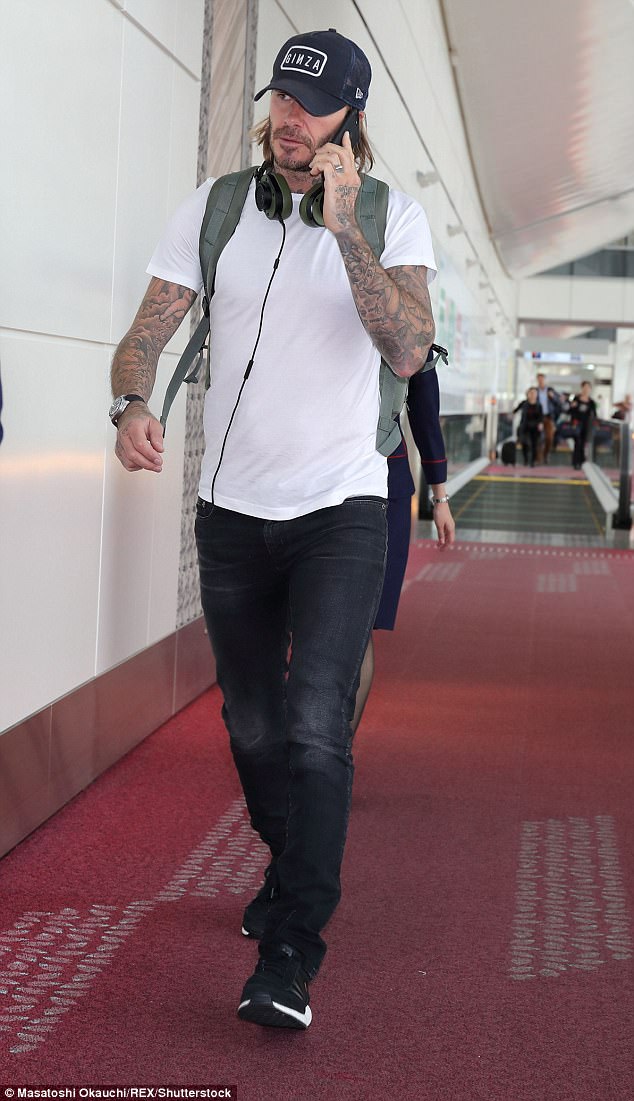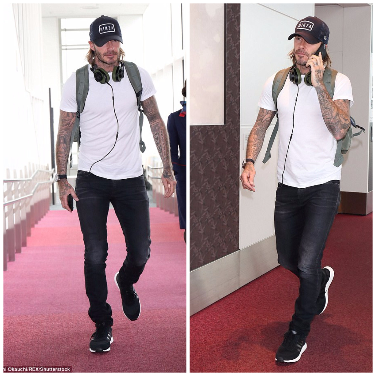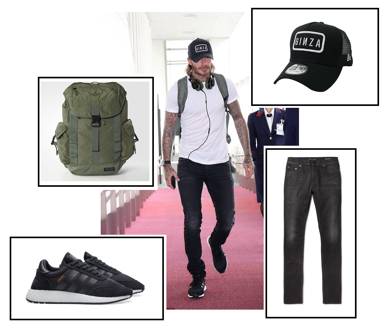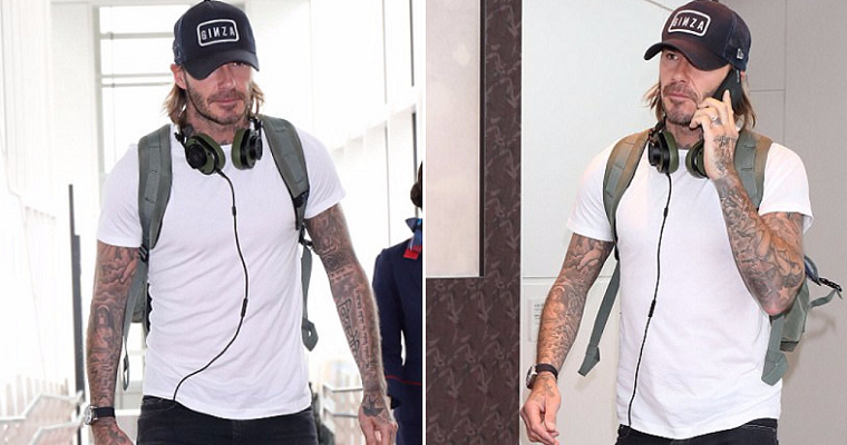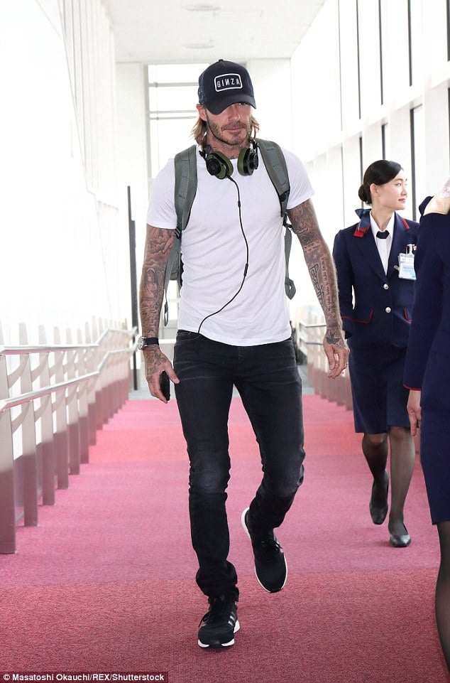 ▼ 當天貝克漢的穿著,簡單俐落就帥氣有型,除了歸功於他運動員挺拔的身材外,穿搭的品味也相當出眾。全身黑白兩色的整體搭配,黑色白字潮感十足的帽子 ( 帽子上印著「銀座」英文 ),露出金色層次的略長髮,臉上帶著不修邊幅的鬍渣,簡單合身剪裁的白色短袖 T 恤,休閒的展現結實的身材和手臂上醒目的刺青,黑色磨白的牛仔褲順勢而下,搭配潮感十足黑色白底復古運動鞋,頸上隨意地掛上耳機,和雙肩背包,簡潔出眾。