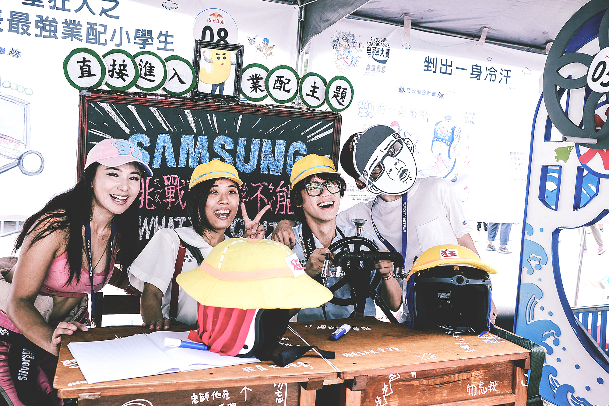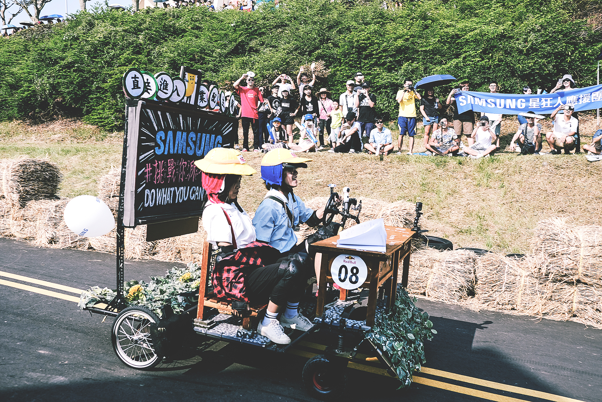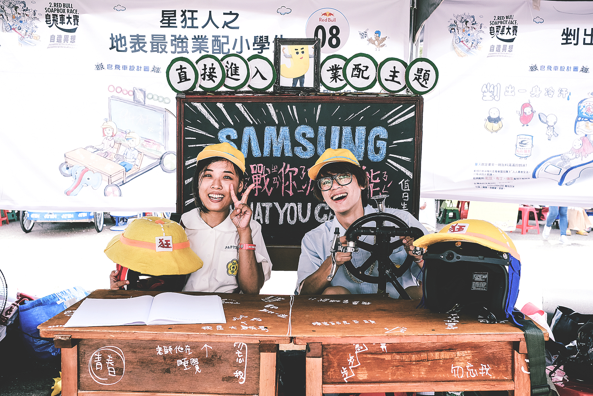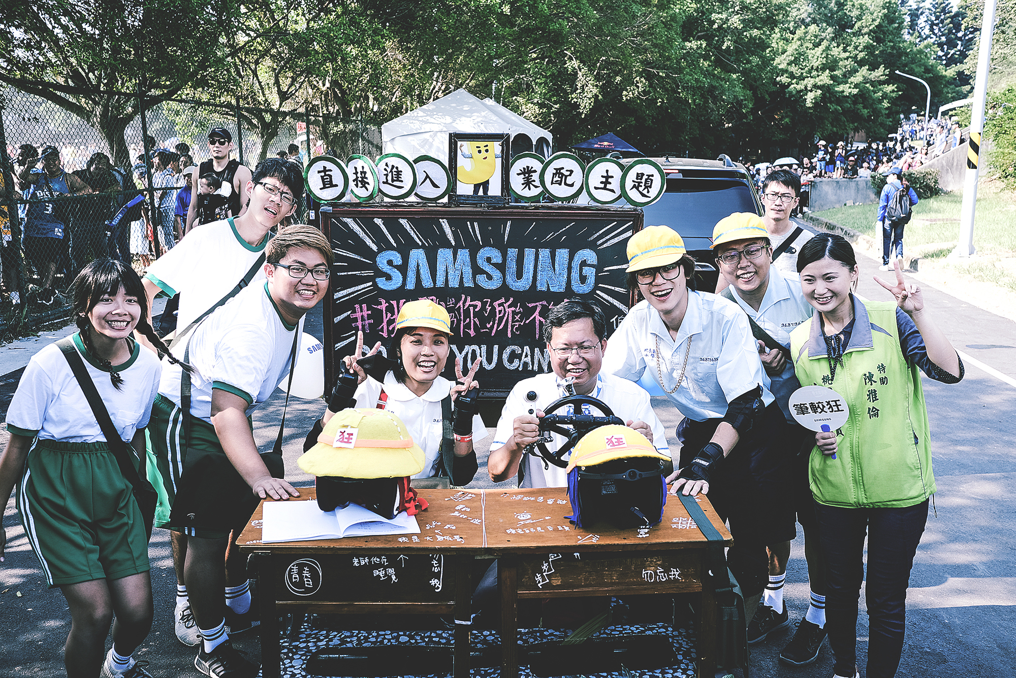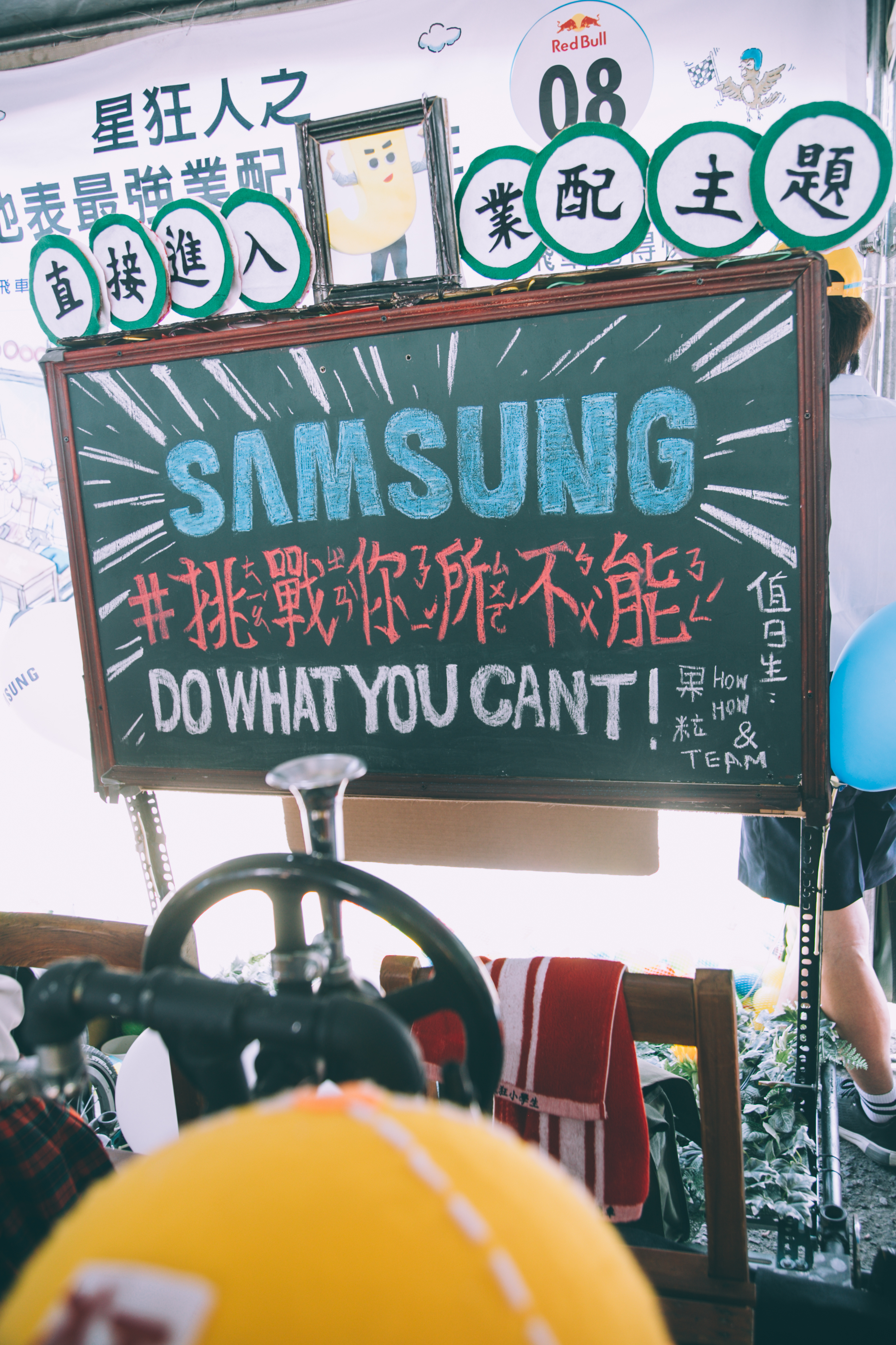 想必各位對整個車體的架構感到好奇吧!現在就來看看這高科技的移動式教室到底是怎麼運作的吧!主體就是黑板本人!上方的國父換成了三星吉祥物 #J森!黑板上大大的 Samsung Logo 果真是直接進入業配主題!路人與參賽者經過 8 號準備區都紛紛露出燦爛的笑容,甚至一度因為太多粉絲要求合照而門庭若市!#挑戰你所不能 Do What You Can't 就是希望大家能不畏懼跌倒,「如果說,人生就像義務教育一樣,必須面對。那就做出自己的方向盤,走出屬於我們的路線吧!」
