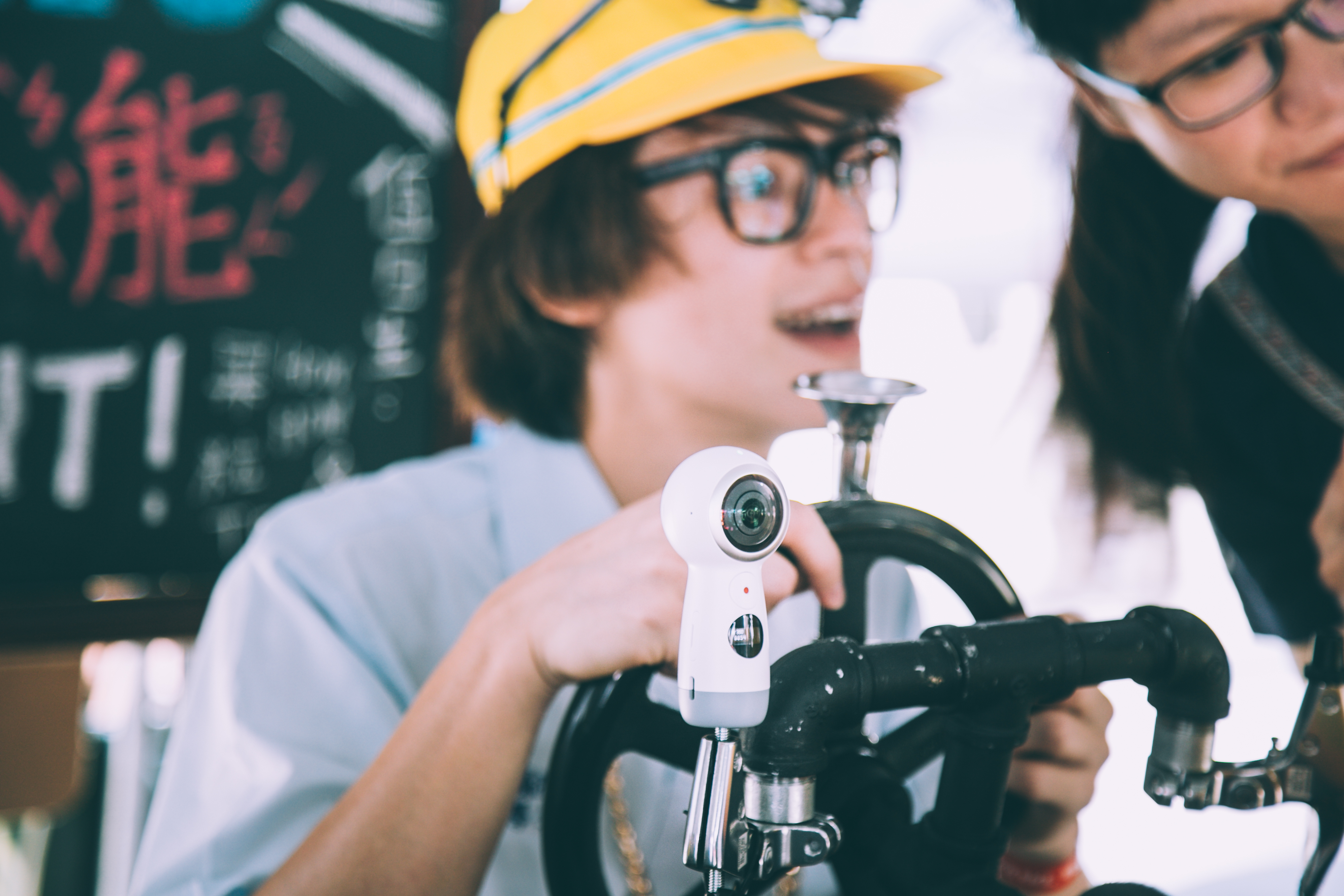車身則由小學木桌椅拼成,方向盤也架上了 Samsung Gear 360,準備將賽程全程錄影!這隻小眼睛可以錄 360 影片,讓青春零死角!