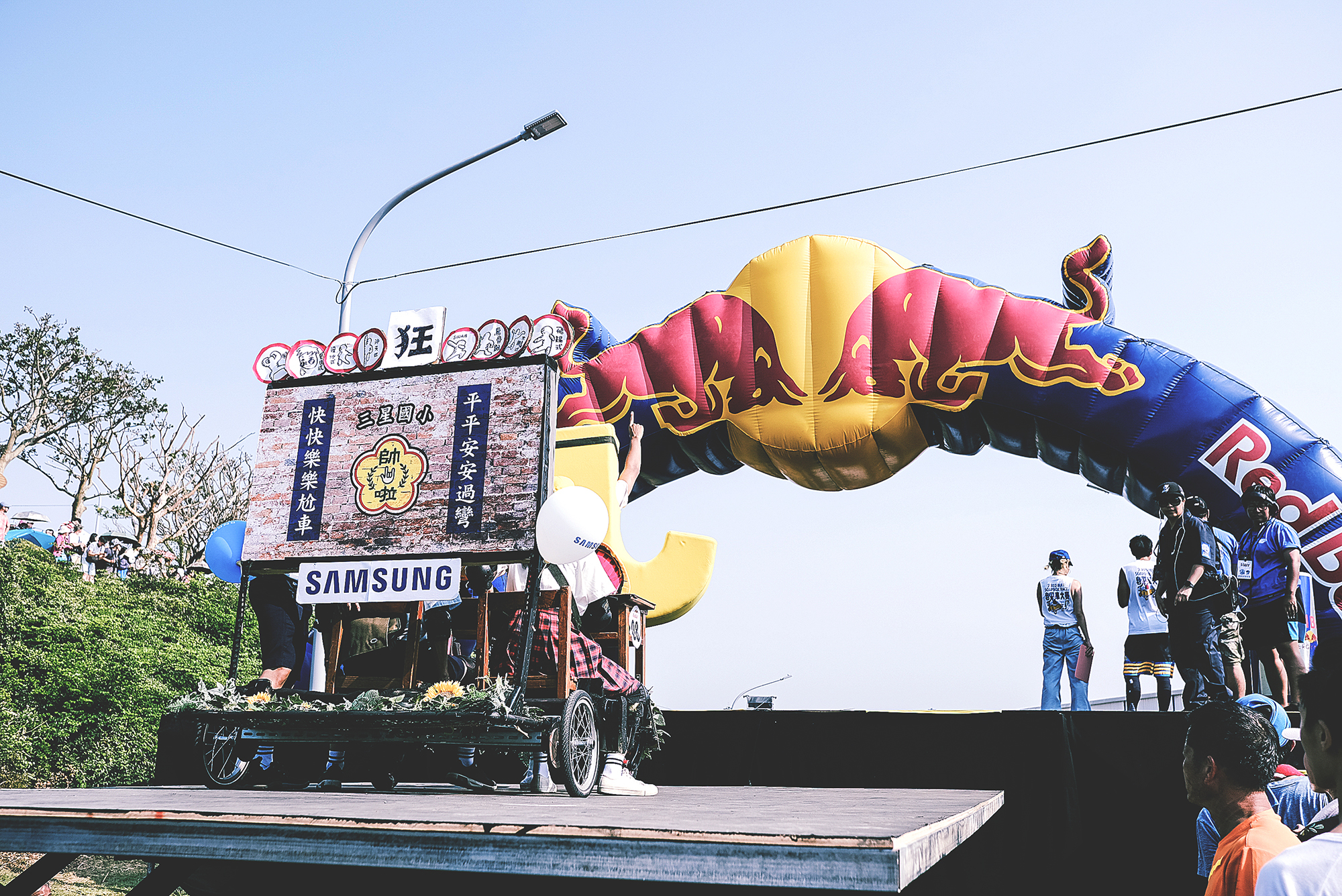 加油隊比參賽者還顯眼啊!從這個角度可以看到車身的設計,除了輪架的設計採用前小後大的車輪,地板居然還是小時候用的石子地板啊!好用心得重現!