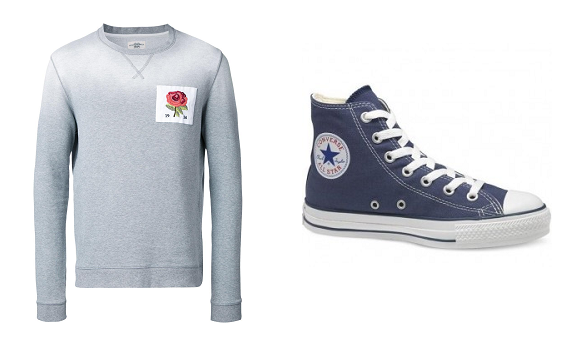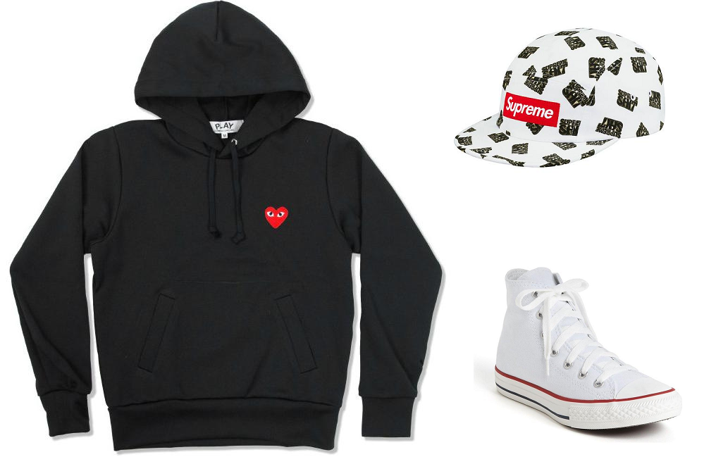 - 羅密歐穿著SUPREME 帽子,Comme des Garcons Play 連帽衫,Converse 球鞋。其中,川久保玲 Comme des Garcons 是羅密歐曾經表示過很喜歡的牌子之一。