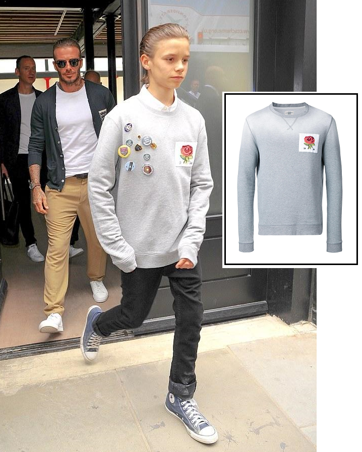 ▼像是六月出席倫敦時裝周時,跟爸爸貝克漢一樣梳起復古油頭。羅密歐穿著灰色玫瑰花刺繡運動衫,露出衣領,微捲褲管,搭配復古經典運動鞋,胸前還細緻的加了大小不一的圓形勳章別針作為裝飾,讓造型更特別。