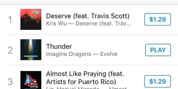 吳亦凡發布了他的最新單曲《Deserve》,找來了火紅的饒舌歌手特拉維斯·斯科特(Travis Scott)助陣,令網友吃驚的是吳亦凡這首歌居然火速 itunes 美區排行榜上登上冠軍寶座,歌曲一路爬升到冠軍僅花了 2 小時,證明《Deserve》熱度非凡,這也是華人歌手締造出的最佳紀錄。