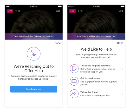 當你看到有人正在直播時,看起來極度悲傷、痛苦,或是需要協助時,你可以馬上匿名舉報!對方便會馬上看到 Instagram 提供的協助,像是生命專線,或是打給你所信任的朋友傾訴,及一些也許能讓心境好轉的建議。Instagram 對此設置一個團隊,讓此功能在全世界、每 24 小時都有專員回應此舉報。