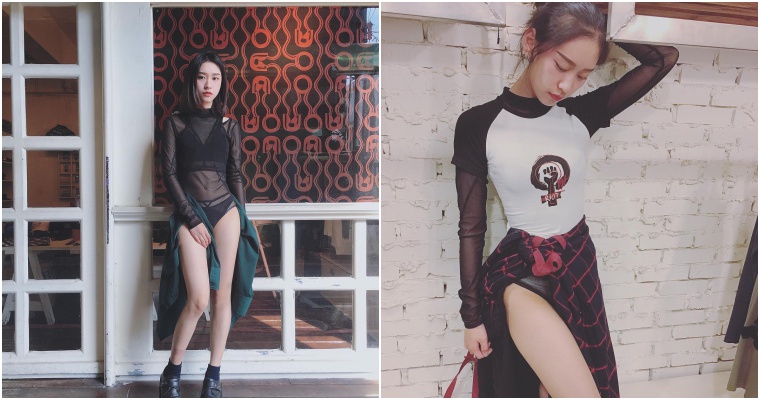 ▲ 左圖泳裝外搭配長袖薄紗上衣,並綁在腰間繫上祖母綠襯衫,誰說泳裝只能在海邊穿!右圖 Body Suit 下著繫外套露出纖纖細腿,能這樣穿的應該王唯了吧!