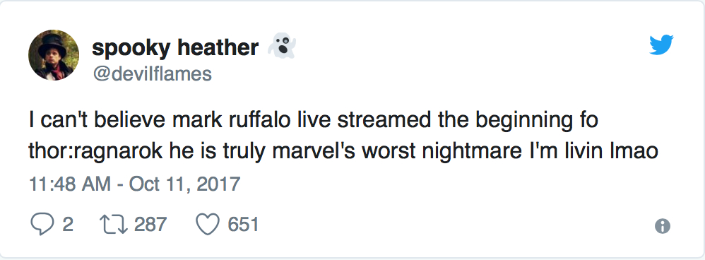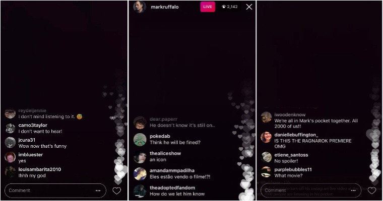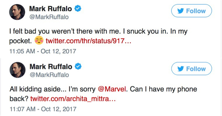 雖然不清楚這是否也屬於漫威宣傳手法內,畢竟對《復仇者3》保密到家的漫威,早在先前就完成拍攝卻遲遲未曝光預告,即便《雷神3》上映日期將近,漫威會讓馬克盧法洛冒這麼大的風險透露劇情嗎?不過在「漫威洩密王」馬克盧法洛直播完隔一天,他先以開玩笑方式留言:「很遺憾你們無法和我一起看首映,但我偷偷帶你們進來了,在我的口袋裡。」但沒隔多久,馬克盧法洛卻可憐兮兮的再次發文:「剛剛是開玩笑的,漫威對不起,我可以拿回手機了嗎?」