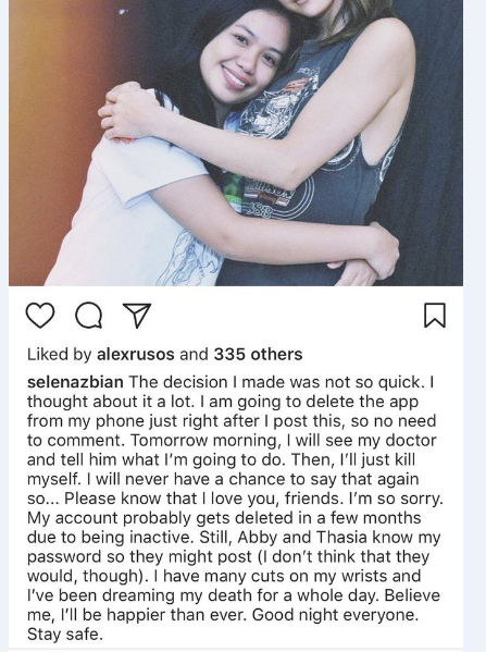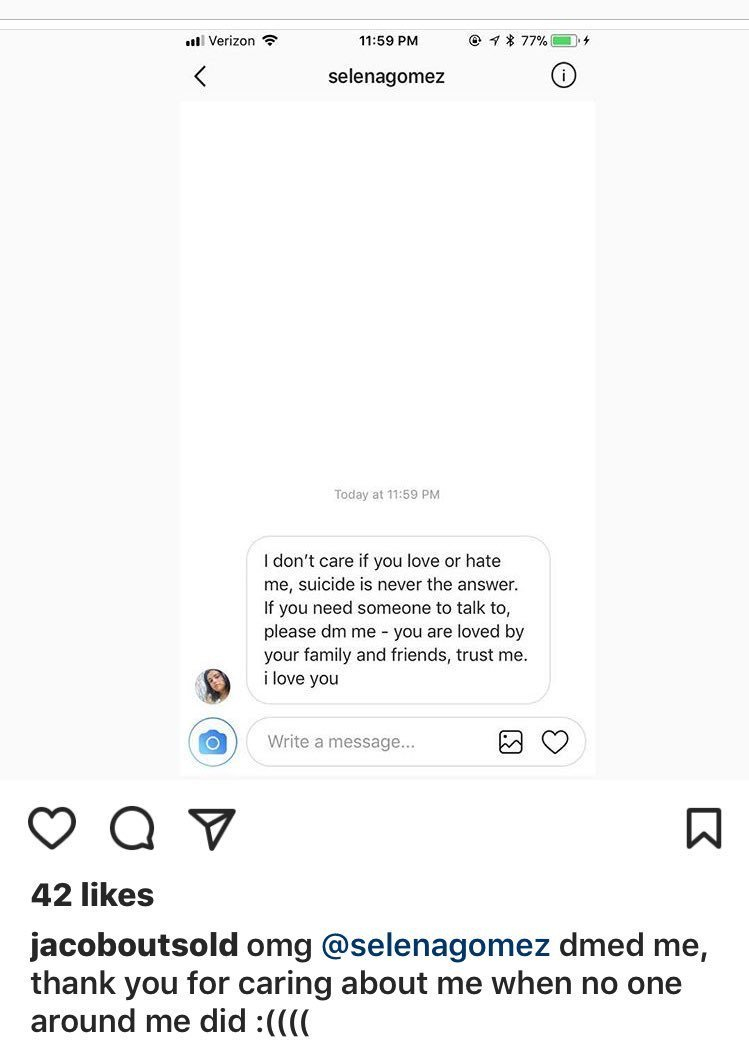 ▼更令人暖心的是,當賽琳娜發現有想要傷害自己念頭的粉絲,她當下就毫不猶豫地親自傳訊息給對方:「不管你是愛我或者是討厭我,我都要告訴你自殺絕對不是解答,如果你需要找一個人傾訴,拜託請私訊給我,你的家人和朋友都愛你,相信我,我也愛你。」