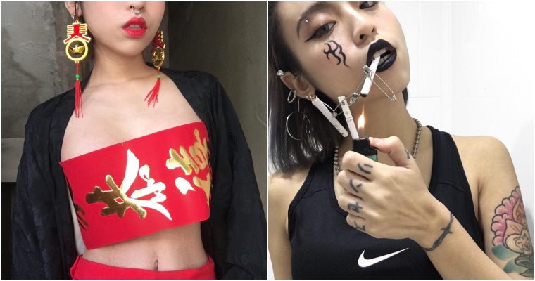 ▲ 子妮的搞怪造型永遠不嫌少,左圖示範「最強拜年裝」直接將恭喜發財春聯穿上身,春字的耳環為整理造型加分!右圖將迴紋針與香菸結合的耳環,這樣的耳環你沒看過吧!