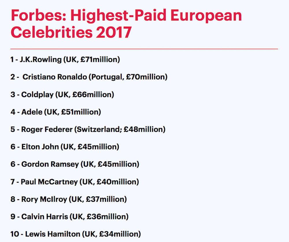 魔法財超好賺!福布斯公布 2017「鈔票發電機」歐洲名人榜 J.K.羅琳再打敗酷玩、愛黛兒奪冠