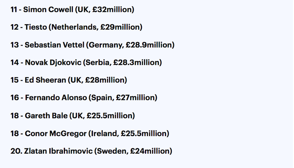 在全球具有龐大影響力及公信力的美國商業雜誌《福布斯》( Forbes ) ,時常會列出每年名人富豪榜、影響排名受到民眾們喜愛,在每年 8 月都會公布好萊塢名人片酬最高排名,今年由艾瑪史東 ( Emma Stone ) 以及馬克華伯格 ( Mark Wahlberg ) 奪冠,除了名人以外,《福布斯》也列出了以地區性為主的排行所得,並在昨天公佈歐洲收入最高的名人榜單,大家可以猜到誰是冠軍嗎?