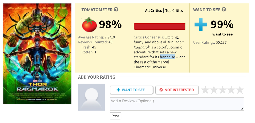 在今天一早,「爛番茄」便給出了漫威在今年的作品中最好的成績,百分之 98 的新鮮度,並給出了:「《雷神3》是一部令人興奮、有趣的故事,最重要的它讓漫威宇宙注入了五彩繽粉的全新力量。」雖然最近幾年「爛番茄」給出的評論影響力越來越大,也有不少導演出面撻伐影評網根本在玷污電影人,但其實「爛番茄」的確是許多影迷們觀賞電影的根基之一,卻無法真正影響每個人前去支持電影的念頭,因此雖然「爛番茄」為《雷神3》打出相當高的評分,也不表示是大家非看不可的片。