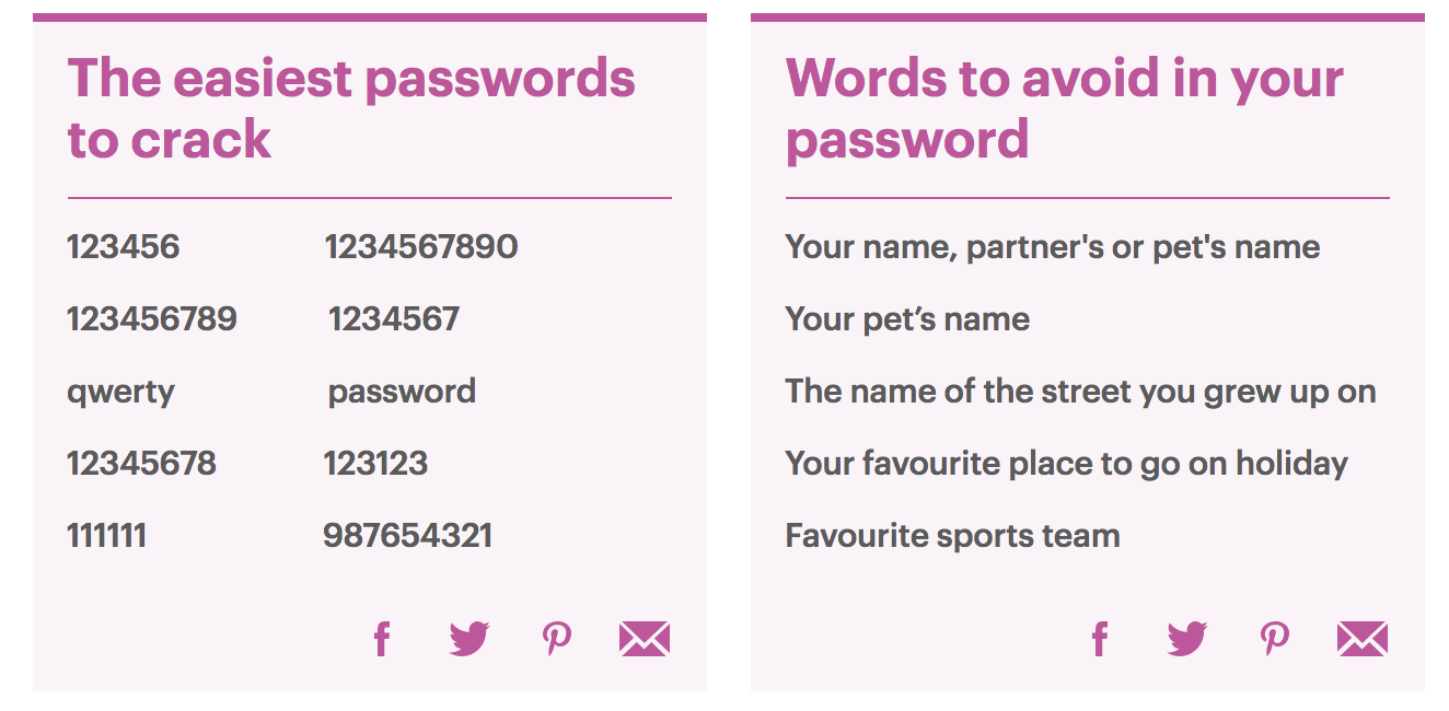雖然有些人認為最安全的選擇一個令人難忘的詞,如伴侶的名字,但這不會使你更安全。駭客會追踪個人信息,如出生日期、寵物的姓名或住在哪裡,這很容易從社交媒體簡介中推斷出來(所以是否要在臉書公開這些資訊要很小心)舉例來說例如:出生年月日用「.」分開,這樣的密碼一個駭客只用13秒就可以破解。