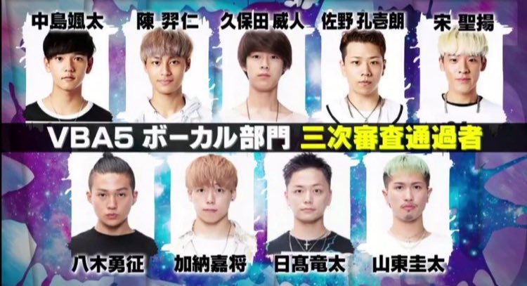 在這次「主唱部門」中,9 位男孩闖入了最終決賽,可以看見在一片日本名字當中,出現了兩位台灣男孩宋聖揚、陳羿仁,令人相當驚喜。其中 22 歲的宋聖揚身高 176 公分,染上非常有 EXILE 風格的金髮的他,從高中時代就非常想要成為歌手,4 年來不斷參加歌唱節目和明星選秀比賽,能夠入選 EXILE 這次新秀決選,證明他還是相當有潛力。