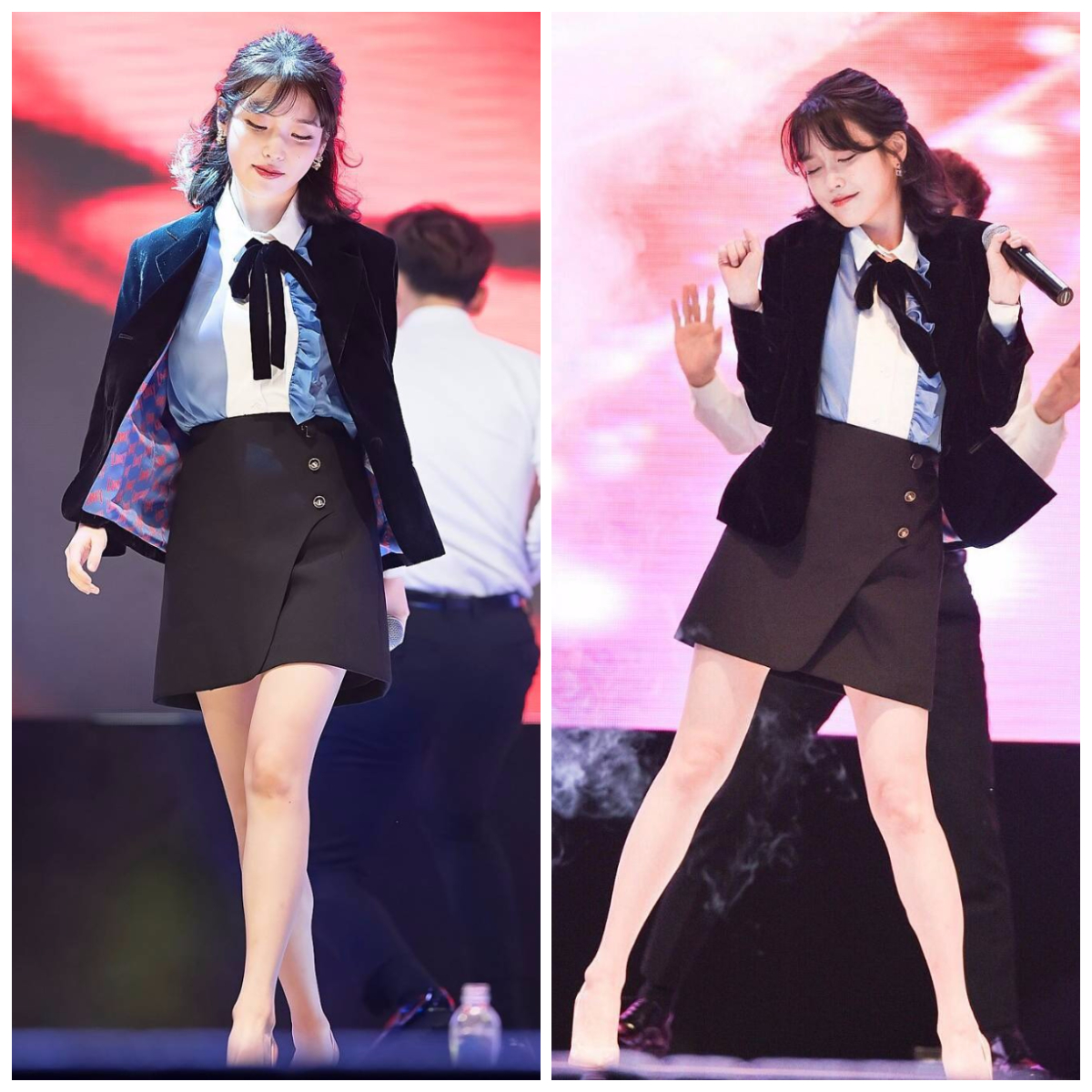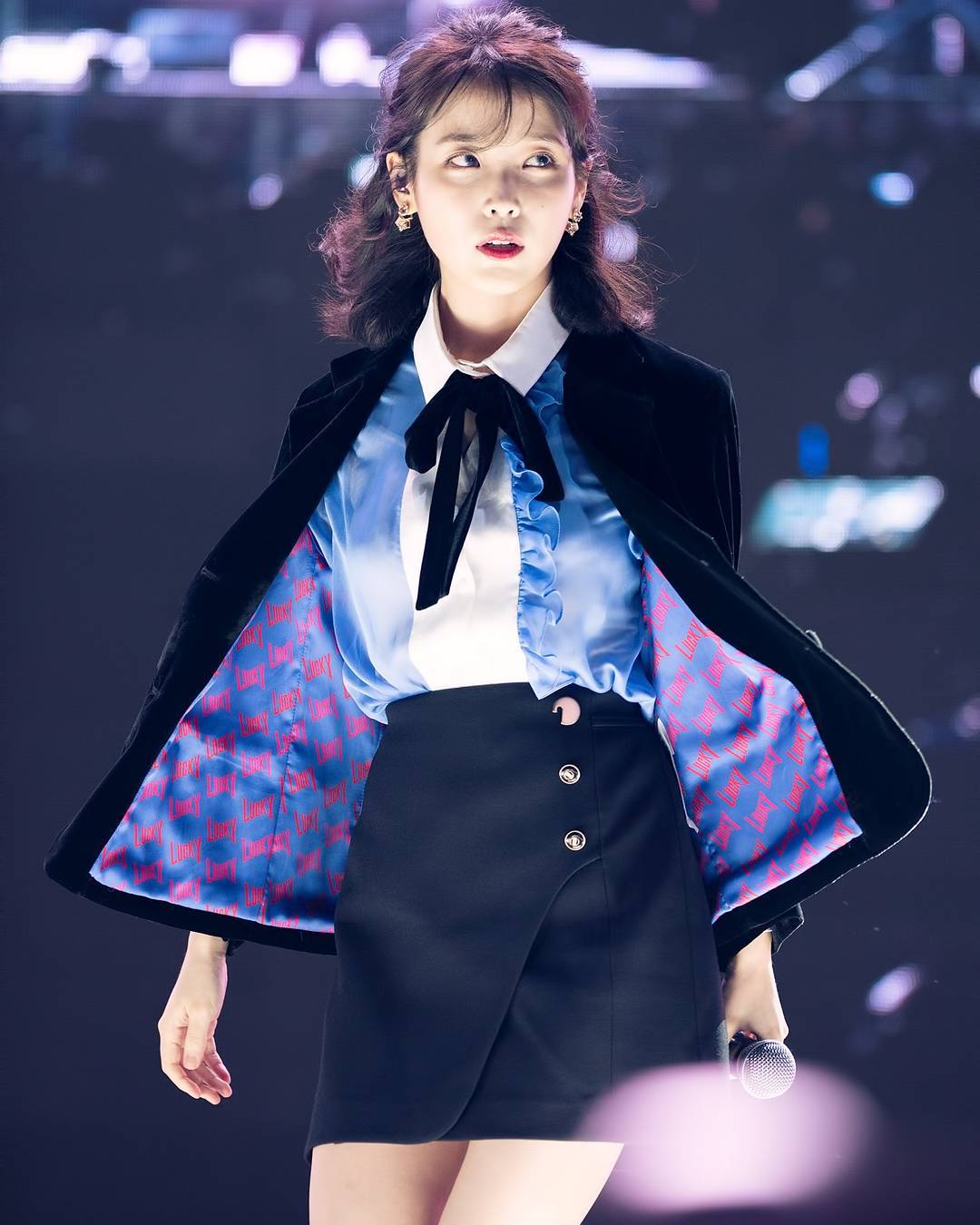 ▼當天 IU 一襲黑色絲絨西裝短裙套裝,搭配絲藍色蝴蝶結襯衫,清新淡雅的妝容,秀麗的公主頭短髮,相當清新脫俗。