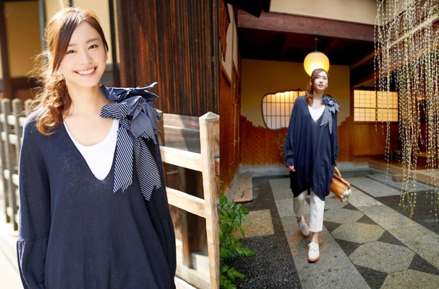 2011 年《旅色》月刊所拍攝的新垣結衣,許多造型之中有一套穿著寬鬆藍色毛衣,左肩上還有一坨不規則蝴蝶結,雖然內搭白衣、白褲是讓色彩上平衡些,但這身服裝版型不僅讓新垣結衣看起來很壯,肩上裝飾更讓結衣的上半身比例太重!