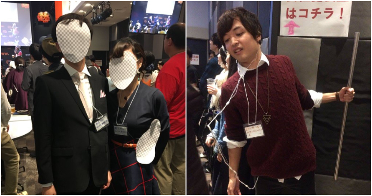 ▼左圖的情侶假扮成「正在被 PS 修圖的人」,不過大家猜得出來右邊的男生角色為何嗎?答案是「電車上耳機被勾住的人」。