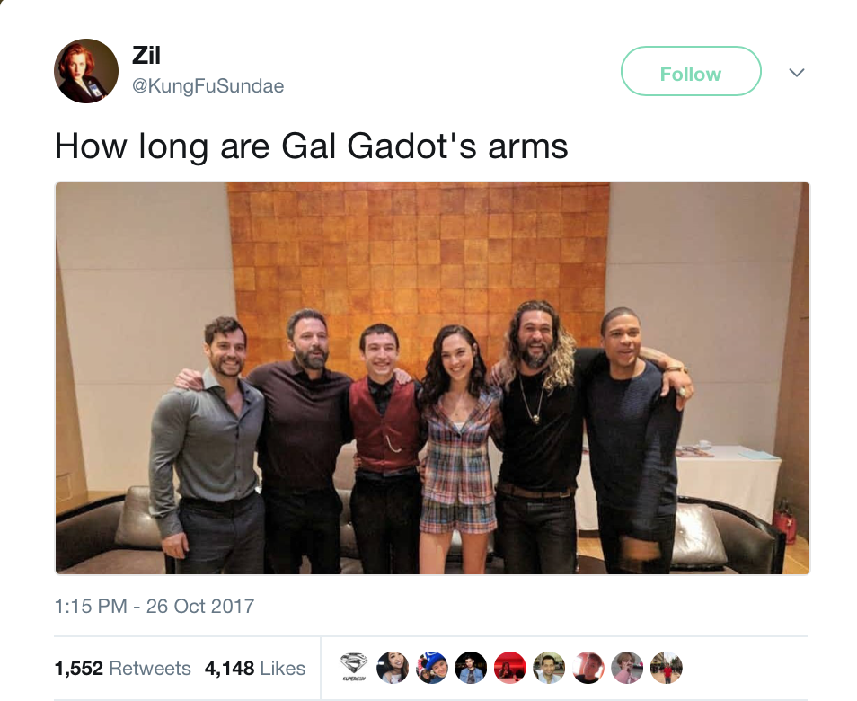 在《神力女超人》裡演出宙斯以及亞馬遜女王的女兒「黛安娜」,蓋兒加朵除了擁有飛行、強大體能、癒合因子以及智能外,最近和《正義聯盟》演員們的合體照中,似乎被網友們發現其實蓋兒加朵還有一項技能尚未被發掘,那便是驚人的身體延展性!
