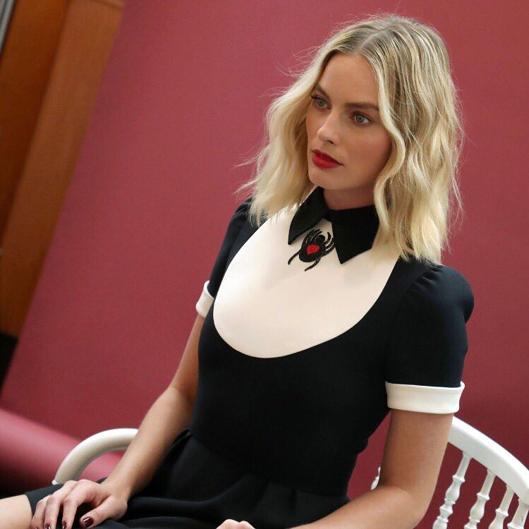 ▼昨天瑪格羅比穿著一襲黑白相間的小洋裝。一向喜歡穿著中有些小特點的瑪格羅比,洋裝上的蜘蛛刺繡讓一身像乖乖牌的洋裝變成更具風格,就像《阿達一族》(The Addams Family)的女兒 Wednesday 一樣,充滿了暗黑氣息。