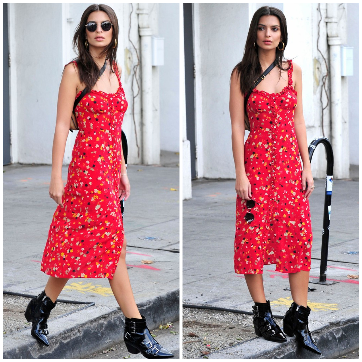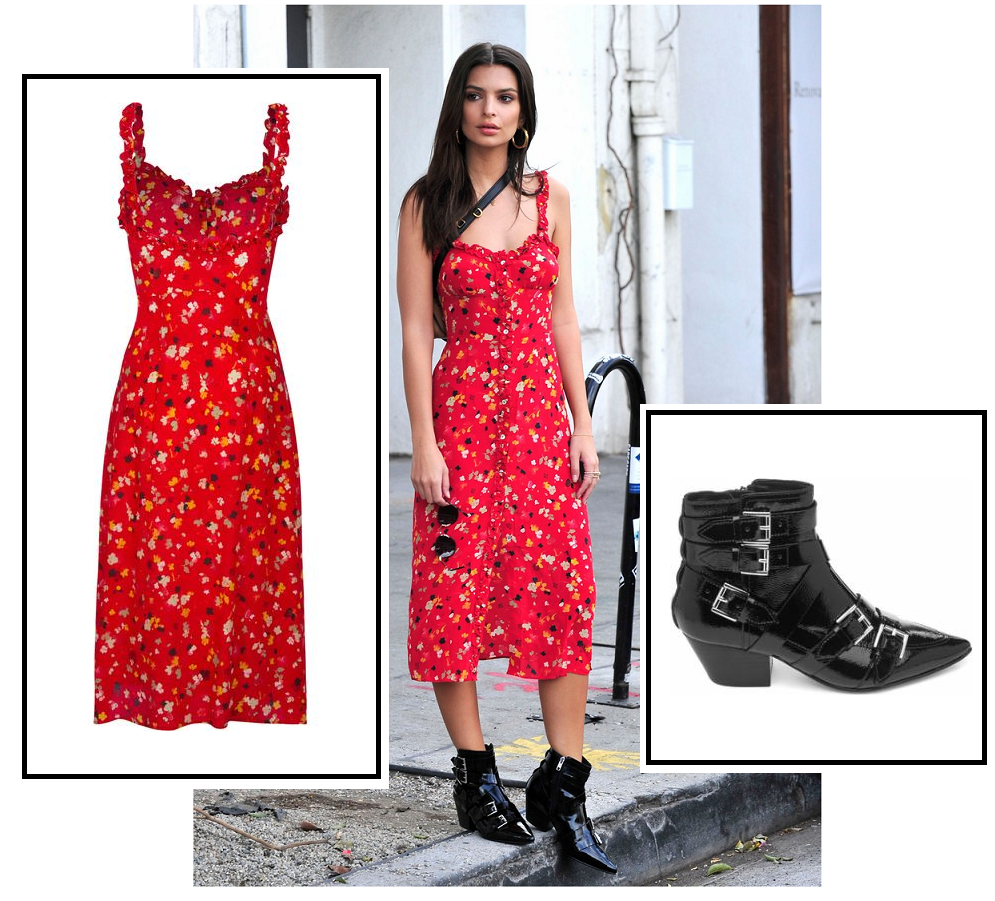 ▼艾蜜莉穿著一襲充滿少女氣息的紅色印花洋裝,搭配一雙有著復古搖滾風格的漆皮亮靴,以及今年最流行的復古腰包。