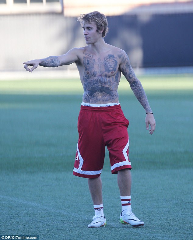 ▼小賈斯汀打赤膊踢足球,秀出了他在上個月花 26 小時完成的大片刺青圖案。